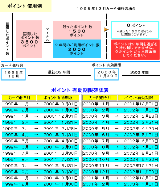 お手元のカードに印字されている発行月を下記の表に照らし合わせて、あなたのポイントの有効期限をご確認ください。カード 発行月は「西暦年の下2桁/月2桁」の形式で印字されていますので、1998年11月の場合は「98/11」、2000年8月の場合は「00/08」とな ります。