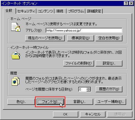 (2)[インターネットオプション]のタブシートの下にある、[フォント]をクリック。