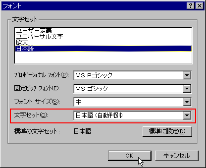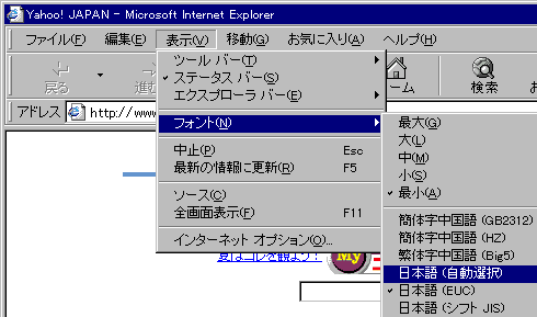 | 2. 文字セットを「自動判別」にする 日本語の文字セットには、JIS、SJIS、EUCの3種があり、Yahoo! JAPANではEUCを用いています。通常は「自動判別」に設定すれば正しく表示されます。 ※バージョン3.0x以前のIEでは、<META>タグを使用したサイトを開くとこの「自動判別」設定がクリアされてしまうことがあります。その場合は再度設定し直してください。 |