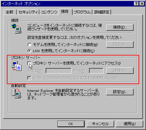 | 3. プロキシサーバーの設定を無効にする プロキシサーバーが設定されていると文字化けが頻繁に発生する傾向があります。もしプロキシサーバーを介さずウェッブにアクセスすることが可能であれば、この設定を解除してください。 |